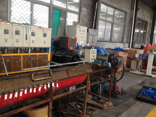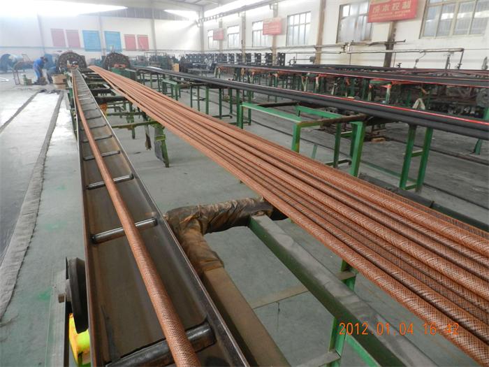 高壓鋼絲纏繞膠管的生產工藝流程:丁腈膠熟煉→內膠層壓出→套管(鐵芯擦硅油)→纏窗紗(窗紗整理切割后纏繞在套管上)→壓上一層中膠→纏繞上第一層鋼絲→上二層中膠→纏繞上第二層鋼絲→上第三層中膠→纏...